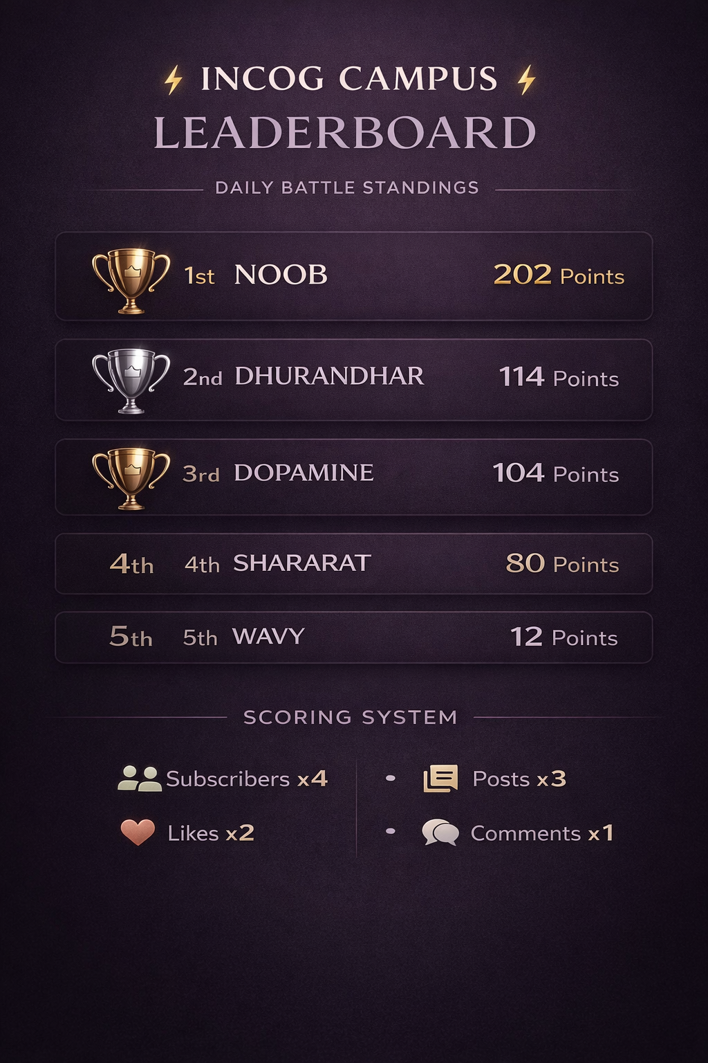 INCOG CAMPUS LEADERBOARD!!