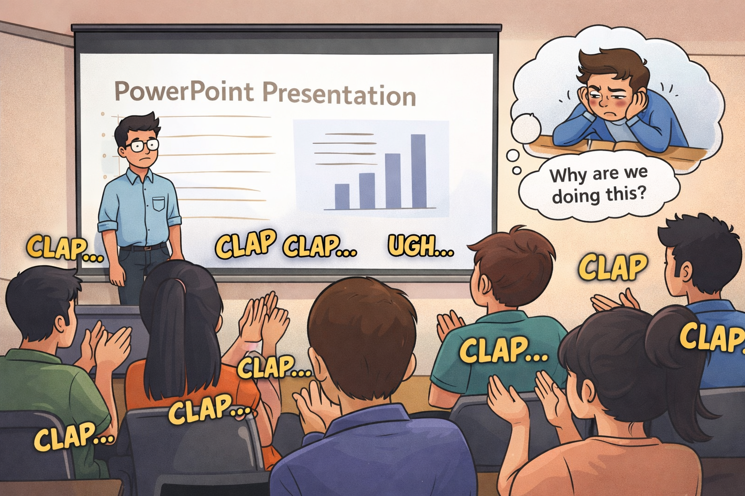 Clapping after every PPT presentation. Presentation kitni bhi kharaab ho clap krna is mandatory 😂