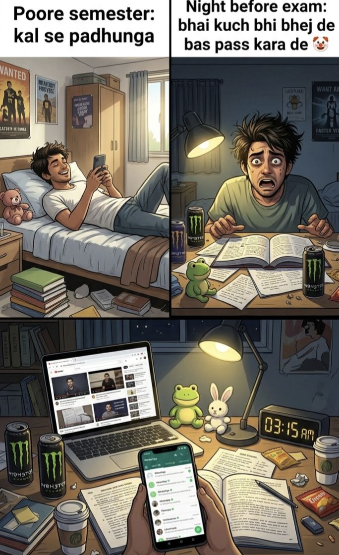 “Poore semester: ‘kal se padhunga’ Night before exam: ‘bhai kuch bhi bhej de bas pass kara de 🤡”